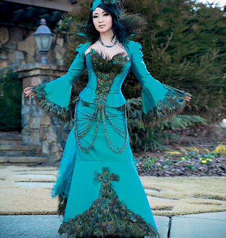Yaya Han is like the top of the Who's Who in cosplay. Savvy is all over this one. But I am thinking 'black'. Raven. Face mask with feathers sweeping up over her head. And maybe one white feather in the mask.